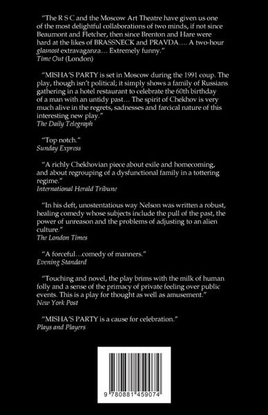 "The R S C and the Moscow Art Theatre have given us one of the most delightful collaborations of two minds, if not since Beaumont and Fletcher, then since Brenton and Hare were hard at the likes of BRASSNECK and PRAVDA.... A two-hour glasnost extravaganza... Extremely funny." Time Out (London) "MISHA'S PARTY is set in Moscow during the 1991 coup. The play, though isn't political; it simply shows a family of Russians gathering in a hotel restaurant to celebrate the 60th birthday of a man with an untidy past... The spirit of Chekhov is very much alive in the regrets, sadnesses and farcical nature of this interesting new play." The Daily Telegraph "Top notch." Sunday Express "A richly Chekhovian piece about exile and homecoming, and about regrouping of a dysfunctional family in a tottering regime." International Herald Tribune "In his deft, unostentatious way Nelson was written a robust, healing comedy whose subjects include the pull of the past, the power of unreason and the problems of adjusting to an alien culture." The London Times "A forceful...comedy of manners." Evening Standard "Touching and novel, the play brims with the milk of human folly and a sense of the primacy of private feeling over public events. This is a play for thought as well as amusement." New York Post "MISHA'S PARTY is a cause for celebration." Plays and Players