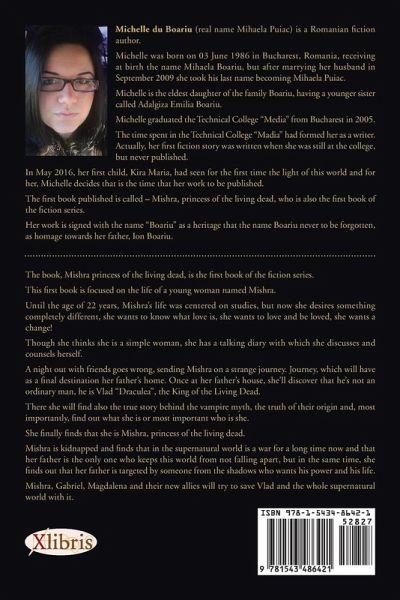 The book, Mishra princess of the living dead, is the first book of the fiction series. This first book is focused on the life of a young woman named Mishra. Until the age of 22 years, Mishra's life was centered on studies, but now she desires something completely different, she wants to know what love is, she wants to love and be loved, she wants a change! Though she thinks she is a simple woman, she has a talking diary with which she discusses and counsels herself. A night out with friends goes wrong, sending Mishra on a strange journey. Journey, which will have as a final destination her father's home. Once at her father's house, she'll discover that he's not an ordinary man, he is Vlad "Draculea", the King of the Living Dead. There she will find also the true story behind the vampire myth, the truth of their origin and, most importantly, find out what she is or most important who is she. She finally finds that she is Mishra, princess of the living dead. Mishra is kidnapped and finds that in the supernatural world is a war for a long time now and that her father is the only one who keeps this world from not falling apart, but in the same time, she finds out that her father is targeted by someone from the shadows who wants his power and his life. Mishra, Gabriel, Magdalena and their new allies will try to save Vlad and the whole supernatural world with it.