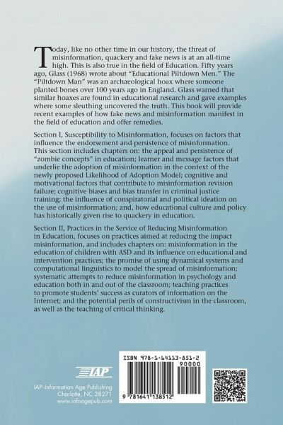 Today, like no other time in our history, the threat of misinformation and disinformation is at an all-time high. This is also true in the field of Education. Misinformation refers to false information shared by a source who intends to inform, but is unaware that the information is false, such as when an educator who recommends the use of a learning strategy that is not actually beneficial. Disinformation is false information shared by a source who has the intent to deceive and is aware that the information is false, such as when a politician claim that high-stakes testing will fix K-12 education when in fact there is no evidence to support this practice. This book provides recent examples of how misinformation and disinformation manifest in the field of education and remedies. Section One, Susceptibility to Misinformation, focuses on factors that influence the endorsement and persistence of misinformation. This section will include chapters on: the appeal and persistence of "zombie concepts" in education; learner and message factors that underlie the adoption of misinformation in the context of the newly proposed Likelihood of Adoption Model; cognitive and motivational factors that contribute to misinformation revision failure; cognitive biases and bias transfer in criminal justice training; the influence of conspiratorial and political ideation on the use of misinformation; and, how educational culture and policy has historically given rise to quackery in education. Section Two, Practices in the Service of Reducing Misinformation in Education, focuses on practices aimed at reducing the impact of misinformation, and includes chapters on: misinformation in the education of children with ASD and its influence on educational and intervention practices; the promise of using dynamical systems and computational linguistics to model the spread of misinformation; systematic attempts to reduce misinformation in psychology and education both in and out of the classroom; and the potential perils of constructivism in the classroom, as well as the teaching of critical thinking. Each section has a discussion chapter that explicates emerging themes and lessons learned and fruitful avenues for future research.