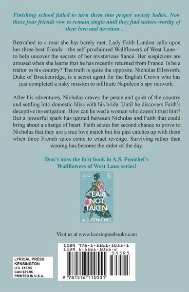 Finishing school failed to turn them into proper society ladies. Now these four friends vow to remain single until they find suitors worthy of their love and devotion . . . Betrothed to a man she has barely met, Lady Faith Landon calls upon her three best friends—the self-proclaimed Wallflowers of West Lane—to help uncover the secrets of her mysterious fiancé. Her suspicions are aroused when she learns that he has recently returned from France. Is he a traitor to his country? The truth is quite the opposite. Nicholas Ellsworth, Duke of Breckenridge, is a secret agent for the English Crown who…mehr