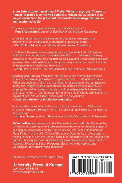 An American president must be master of two arts: politics and management. Without political mastery, he can't get elected, let alone construct the power base he'll need to govern. But without managerial expertise, his policy making will be unintelligent and ineffective. Managerial mastery has been missing from the administrations of all post-World War II presidents, according to Walter Williams. Spurred by popular anti-bureaucratic sentiment and promises to trim the fat from the federal government, presidents from Eisenhower to Carter have decimated the ranks of top-level bureaucrats, leaving the Executive Office of the President alarmingly short of competent policy advice. Reagan took the process a step further. He was, according to Williams, the first explicitly anti-analytic president. Ronald Reagan launched an eight-year war on policy information and analysis, Williams writes. He won. His distaste for expert policy information, analysis, and advice led to the destruction of much of the institutional analytic capacity built up in the Executive Branch. Poor policies and inept governance are the direct result of cutbacks in expert policy information and analytic capacity, Williams contends. He traces the decline of policy analysis since Eisenhower, but focuses his most devastating analysis on Reagan, who cut experts from the agencies, relied on a few hand-picked, mainly political advisers, and held all policy analysis to an ideological standard. The results of the fifty-year trend, according to Williams, are massive budget and trade deficits, public sector underinvestment in physical and human capital that threatens America's superpower status, and a widening gap between rich and poor that is tearing apart the nation's social fabric. Still, the situation is not hopeless. Williams prescribes a series of measures to correct America's course, arguing that government is not just the problem, it's the solution. This is an incisive original analysis of an important issue.--Fred I. Greenstein, author of Evolution of the Modern Presidency. The issues examined here--the emergence of technically trained, professional policy advisers, the proper role of such advisers, and the consequences of presidential failure to seek and use such advisers effectively*#8212;are of major importance to American governance. Others have examined pieces of the puzzle, but until now no one has explored it in this depth, using the methodology of repeated confidential--and very candid--interviews with actual participants in the policy process.--Harry S. Havens, author of The Evolution of the General Accounting Office.