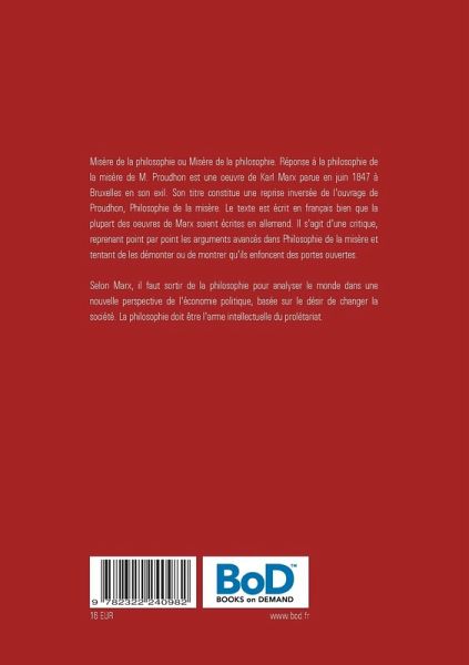 Misère de la philosophie ou Misère de la philosophie. Réponse à la philosophie de la misère de M. Proudhon est une oeuvre de Karl Marx parue en juin 1847 à Bruxelles en son exil. Son titre constitue une reprise inversée de l'ouvrage de Proudhon, Philosophie de la misère. Le texte est écrit en français bien que la plupart des oeuvres de Marx soient écrites en allemand. Il s'agit d'une critique, reprenant point par point les arguments avancés dans Philosophie de la misère et tentant de les démonter ou de montrer qu'ils enfoncent des portes ouvertes.L'ouvrage est composé des deux chapitres : I. « Une découverte scientifique » qui traite la théorie de la valeur, le temps de travail, la monnaie et l'excédent de travail; II. « La métaphysique de l'économie politique » qui traite les sept méthodes, la division du travail, la concurrence, le monopole, la propriété, la rente et les grèves.Selon Marx, il faut sortir de la philosophie pour analyser le monde dans une nouvelle perspective de l'économie politique, basée sur le désir de changer la société. La philosophie doit être l'arme intellectuelle du prolétariat.