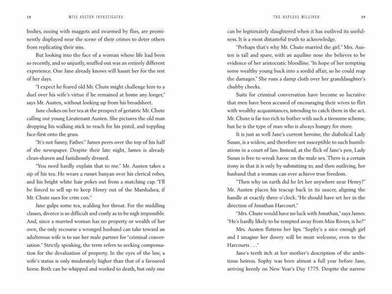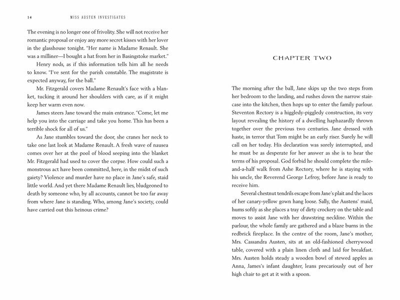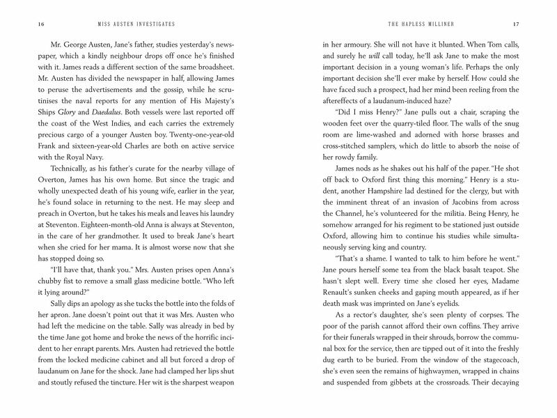 Jane Austen--sparkling, spirited, and incredibly clever--is suddenly thrust into a mystery when a milliner's dead body is found locked inside a cupboard in the middle of a ball. When Jane's brother Georgy is found with some jewelry belonging to the deceased, the local officials see it as an open-and-shut case: one which is likely to end with his death. Jane is certain that he is innocent, and there is more to the murder than meets the eye. Her investigations send her on a journey through local society, as Jane's suspect list keeps on growing--and her keen observational skills of people will be put to the test to solve the crime and save her brother.