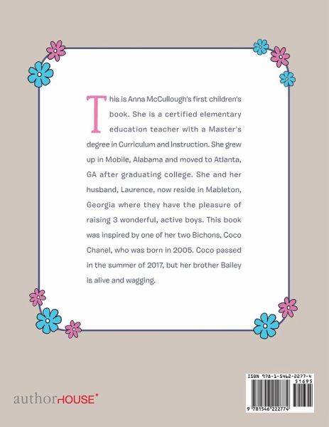 This is Anna McCullough's first children's book. She is a certified elementary education teacher with a Master's degree in Curriculum and Instruction. She grew up in Mobile, Alabama and moved to Atlanta, GA after graduating college. She and her husband, Laurence, now reside in Mableton, Georgia where they have the pleasure of raising 3 wonderful, active boys. This book was inspired by one of her two Bichons, Coco Chanel, who was born in 2005. Coco passed in the summer of 2017, but her brother Bailey is alive and wagging.