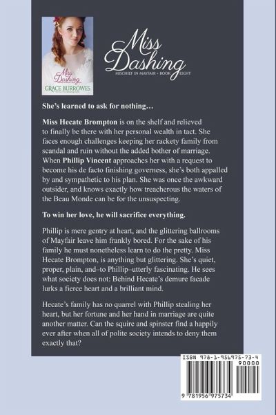 She's learned to ask for nothing... Miss Hecate Brompton is on the shelf and relieved to finally be there with her personal wealth in tact. She faces enough challenges keeping her rackety family from scandal and ruin without the added bother of marriage. When Phillip Vincent approaches her with a request to become his de facto finishing governess, she's both appalled by and sympathetic to his plan. She was once the awkward outsider, and knows exactly how treacherous the waters of the Beau Monde can be for the unsuspecting. To win her love, he will sacrifice everything. Phillip is mere gentry at heart, and the glittering ballrooms of Mayfair leave him frankly bored. For the sake of his family he must nonetheless learn to do the pretty. Miss Hecate Brompton, is anything but glittering. She's quiet, proper, plain, and-to Phillip-utterly fascinating. He sees what society does not: Behind Hecate's demure facade lurks a fierce heart and a brilliant mind. Hecate's family has no quarrel with Phillip stealing her heart, but her fortune and her hand in marriage are quite another matter. Can the squire and spinster find a happily ever after when all of polite society intends to deny them exactly that?