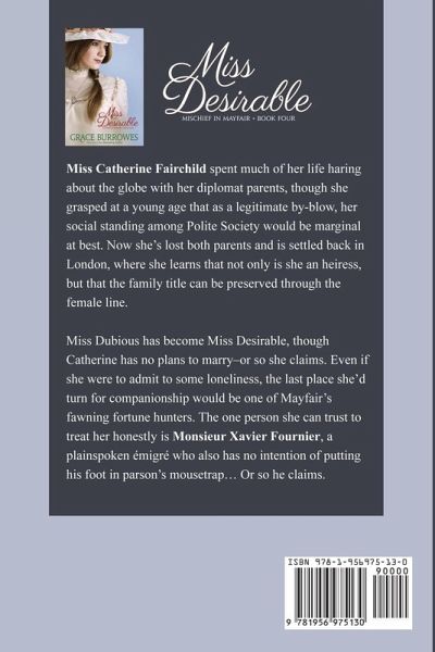Miss Catherine Fairchild spent much of her life haring about the globe with her diplomat parents, though she grasped at a young age that as a legitimate by-blow, her social standing among Polite Society would be marginal at best. Now she's lost both parents and is settled back in London, where she learns that not only is she an heiress, but that the family title can be preserved through the female line. Miss Dubious has become Miss Desirable, though Catherine has no plans to marry-or so she claims. Even if she were to admit to some loneliness, the last place she'd turn for companionship would be one of Mayfair's fawning fortune hunters. The one person she can trust to treat her honestly is Monsieur Xavier Fournier, a plainspoken émigré who also has no intention of putting his foot in parson's mousetrap... Or so he claims.