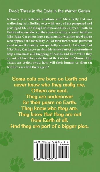 Book 3 in the Mom's Choice Award-winning Cats in the Mirror series. Jealousy is a festering emotion, and Miss Fatty Cat was wallowing in it. Boiling over with envy of the pampered and privileged life she thought Kimba and Hiro enjoyed--both on Earth and as members of the space-traveling cat royal family--Miss Fatty Cat enters into a partnership with the rebel group who opposes the monarchy. All of their treacherous plans fall apart when the family unexpectedly moves to Arkansas, but Miss Fatty Cat discovers that this is the perfect opportunity to help orchestrate a kidnapping of Kimba and Hiro while they are cut off from the protection of the Cats in the Mirror. If the sisters are stolen away, how will their human or alien cat families ever find them again? Some cats are born on Earth and never know who they really are. Others are sent. They are undercover for their years on Earth. They know who they are. They know that they are not from Earth at all. And they are part of a bigger plan.