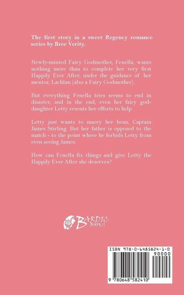 The first story in a sweet Regency romance series by Bree Verity. Newly-minted Fairy Godmother, Fenella, wants nothing more than to complete her very first Happily Ever After under the guidance of her mentor, Lachlan (also a Fairy Godmother). But everything Fenella tries seems to end in disaster, and in the end, even her fairy goddaughter, Letty, resents her efforts to help. Letty just wants to marry her beau, the dashing Captain James Stirling. But her father is opposed to the match - to the point where he forbids Letty from even seeing James. How can Fenella fix things and give Letty the Happily Ever After that she deserves?