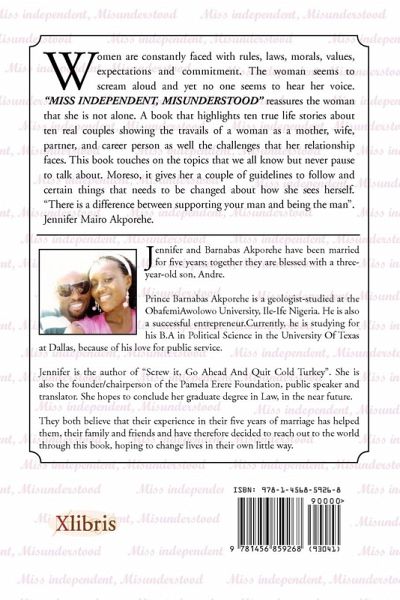 Women are constantly faced with rules, laws, morals, values, expectations and commitment. The woman seems to scream aloud and yet no one seems to hear her voice. "MISS INDEPENDENT, MISUNDERSTOOD" reassures the woman that she is not alone. A book that highlights ten true life stories about ten real couples showing the travails of a woman as a mother, wife, partner, and career person as well the challenges that her relationship faces. This book touches on the topics that we all know but never pause to talk about. Moreso, it gives her a couple of guidelines to follow and certain things that needs to be changed about how she sees herself. "There is a difference between supporting your man and being the man". Jennifer Mairo Akporehe.