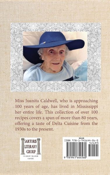 Miss Juanita, now approaching 98 years of age, first moved to the Mississippi Delta with her family during the late 1930s after her father’s two department stores in Tupelo disappeared almost overnight—one was burned to the ground by an arsonist, the other was robbed by criminals in large trucks who cleaned out the merchandise late one night. The granddaughter of one of the framers of the Mississippi Constitution of 1890 and the cousin to a member of the House of Representatives, Hilton Waits of Leland, who also served as speaker pro tem, she survived the loss of her first husband, James L. Dickerson, who served in the Army Air Corps during World War II but was killed in a boating accident in the 1950s, and raised two children as a single mother—the daughter ending up teaching nursing and the son ending up working for some of the South’s best newspapers and writing more than 30 books—only to later survive the cancer death of her second husband, Dick Caldwell, a retired World War II U.S. Army captain and businessman …. all the time collecting recipes for meals that were prepared while living daily life in the heart of the Mississippi Delta. This remarkable collection of over 100 recipes serves as a culinary documentary representing more than 80 years of preparing and enjoying the unique cuisine of the Mississippi Delta, a unique place both geographically and culturally. Some of the recipes in the book, such as the one for Thanksgiving and Christmas cornbread dressing, and the one for chicken ‘n’ Dumplin’s, date back to the 1930s, while others such as the ones for Tamale Pie and Amalgamation Cake emerged in the 1950s. For those who walk on the wild side there are recipes for Squirrel Dumplin’s, Wild Dove, and marinated venison. For those with a sweet tooth, there is a recipe for Miss Juanita’s most popular desert, Frozen French Pastry, along with recipes for banana pudding, her incredible caramel pie, chocolate cake, light-as-air Meringue Kisses, Date Nut Cake, Southern Lemon Icebox Pie, and Toasted Coconut Pie. Reading the book offers a culinary walk through Mississippi Delta history.