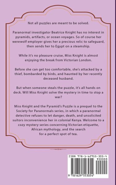 Not all puzzles are meant to be solved. Paranormal investigator Beatrice Knight has no interest in pyramids, artifacts, or ocean voyages. So of course her werewolf employer gives her a precious relic to safeguard, then sends her to Egypt on a steamship. While it's no pleasure cruise, Miss Knight is almost enjoying the break from Victorian London. Before she can get too comfortable, she's attacked by a thief, bombarded by birds, and haunted by her recently deceased husband. But when someone steals the puzzle, it's all hands on deck. Will Miss Knight solve the mystery in time to stop a war? Miss Knight and the Pyramid's Puzzle is a prequel to the Society for Paranormals series, in which a paranormal detective refuses to let danger, death, and unsolicited suitors inconvenience her in colonial Kenya. Welcome to a cozy mystery series concerning Victorian etiquette, African mythology, and the search for a perfect spot of tea.