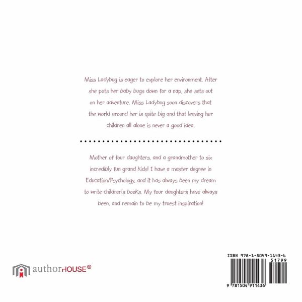Miss Ladybug is eager to explore her environment. After she puts her baby bugs down for a nap, she sets out on her adventure. Miss Ladybug soon discovers that the world around her is quite big and that leaving her children all alone is never a good idea.