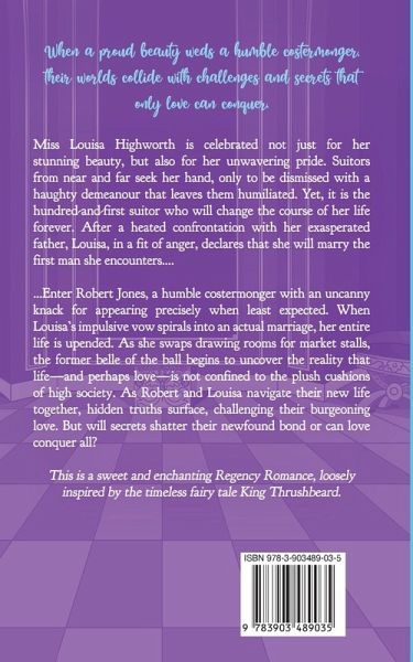 When a proud beauty weds a humble costermonger, their worlds collide with challenges and secrets that only love can conquer. Miss Louisa Highworth is celebrated not just for her stunning beauty, but also for her unwavering pride. Suitors from near and far seek her hand, only to be dismissed with a haughty demeanour that leaves them humiliated. Yet, it is the hundred-and-first suitor who will change the course of her life forever. After a heated confrontation with her exasperated father, Louisa, in a fit of anger, declares that she will marry the first man she encounters... ...Enter Robert Jones, a humble costermonger with an uncanny knack for appearing precisely when least expected. When Louisa's impulsive vow spirals into an actual marriage, her entire life is upended. As she swaps drawing rooms for market stalls, the former belle of the ball begins to uncover the reality that life-and perhaps love-is not confined to the plush cushions of high society. As Robert and Louisa navigate their new life together, hidden truths surface, challenging their burgeoning love. But will secrets shatter their newfound bond or can love conquer all? This is a sweet and enchanting Regency Romance, loosely inspired by the timeless fairy tale King Thrushbeard. Escape into the world of Sofi Laporte's Regency ton, where spinsters are merry, rakes are charming, and no one is who they seem. Other books in the Merry Spinsters, Charming Rogues Series:Lady Ludmilla's Accidental Letter Miss Ava's Scandalous Secret Lady Avery and the False Butler