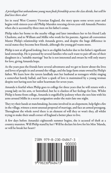 A privileged but unhandsome young man finds friendship across the class divide, but will he find love there also? Set in rural West Country Victorian England, the story spans some seven years and begins with sixteen-year-old Philip Marsden rescuing eleven-year-old Amanda Prentice when she is accosted by three men on his father's estate. Philip takes her to her home in the nearby village, causing a stir amongst the locals by riding two to a horse. He later introduces her to his oldest friend, Lady Charlotte, and to handsome William and beautiful Millie who work for his parents. Against all convention Master Philip's relationship with Amanda grows despite the age-gap; and despite the huge difference in social status they become best friends, although the young girl wants more. They love to trade insults and banter as this close and ever deepening friendship develops. Philip is not at all good looking, but is an eligible bachelor due to his father's significant land ownership. He is pursued by several families who each want to pair off one of their daughters in a "suitable marriage" but he is not interested and swears he will only marry for love, giving Amanda hope. Unfortunately for her, she has competition from several well to do young ladies Philip's own age. As the years pass the friends have several adventures and we get to know about the lives and loves of people from the village and large farm estate owned by Philip's father, who is a social reformer. We learn how the tavern landlady met her husband as teenagers whilst singing a somewhat bawdy ballad, and how a spark of love is maintained by a young woman despite not having seen her sailor heartmate for seven years. Amanda is fearful when Philip goes away to college for three years that he will return with a young lady on his arm, or worst still, betrothed. He is clueless of her feelings for him, until that is she blurts it out as they return from haymaking with some of the tenant farmers after showing her his college acceptance letter. Whilst Philip is home from college, Amanda is engulfed by jealousy when she sees him with his arms around Millie in a secret assignation under the stairs late one night. Despite this, the pair manage to remain friends. They try their hands at matchmaking, become involved in an elopement, help fight a fire in the village, witness a most unusual proposal of marriage, and face an armed pressgang. Throughout the whole novel there is an element of will they or won't they, all whilst trying to make their small corner of England a better place to live. A few days before Amanda's eighteenth summer begins, she is accused of theft at a country mansion. Will Philip stand by her? Will he declare his love for his Miss 'Manda, or will he break her heart?
