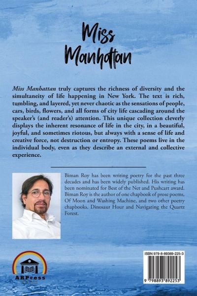 Miss Manhattan truly captures the richness of diversity and the simultaneity of life happening in New York. The text is rich, tumbling, and layered, yet never chaotic as the sensations of people, cars, birds, flowers, and all forms of city life cascading around the speaker's (and reader's) attention. This unique collection cleverly displays the inherent resonance of life in the city, in a beautiful, joyful, and sometimes riotous, but always with a sense of life and creative force, not destruction or entropy. These poems live in the individual body, even as they describe an external and collective experience.