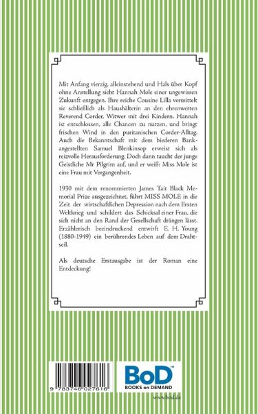 Mit Anfang vierzig, alleinstehend und Hals über Kopf ohne Anstellung sieht Hannah Mole einer ungewissen Zukunft entgegen. Ihre reiche Cousine Lilla vermittelt sie schließlich als Haushälterin an den ehrenwerten Reverend Corder, Witwer mit drei Kindern. Hannah ist entschlossen, alle Chancen zu nutzen, und bringt frischen Wind in den puritanischen Corder-Alltag. Auch die Bekanntschaft mit dem biederen Bankangestellten Samuel Blenkinsop erweist sich als reizvolle Herausforderung. Doch dann taucht der junge Geistliche Mr Pilgrim auf, und er weiß: Miss Mole ist eine Frau mit Vergangenheit. 1930 mit dem renommierten James Tait Black Memorial Prize ausgezeichnet, führt MISS MOLE in die Zeit der wirtschaftlichen Depression nach dem 1. Weltkrieg und schildert das Schicksal einer Frau, die sich nicht an den Rand der Gesellschaft drängen lässt. Erzählerisch beeindruckend entwirft E. H. Young (1880-1949) ein berührendes Leben auf dem Drahtseil. Als deutsche Erstausgabe ist der Roman eine Entdeckung!