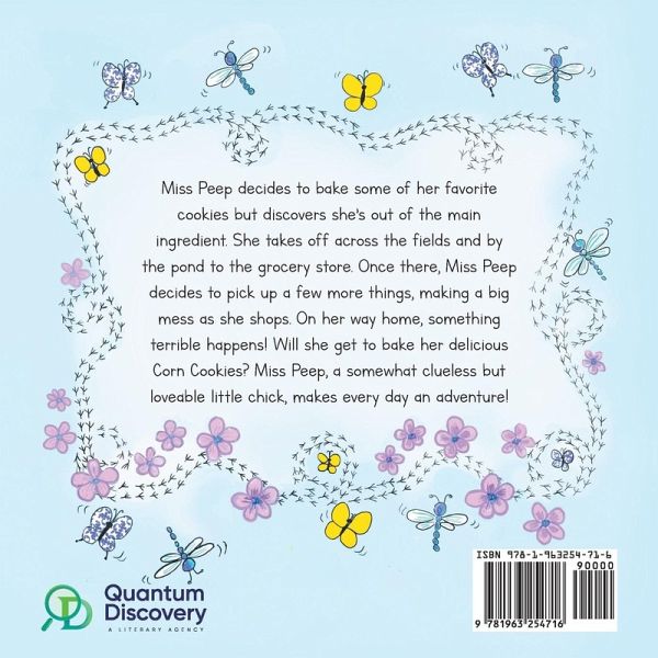 Miss Peep decides to bake some of her favorite cookies but discovers she's out of the main ingredient. She takes off across the fields and by the pond to the grocery store. Once there, Miss Peep decides to pick up a few more things, making a big mess as she shops. On her way home, something terrible happens! Will she get to bake her delicious Corn Cookies? Miss Peep, a somewhat clueless but loveable little chick, makes every day an adventure! Miss Peep is dedicated to my husband Terry, my sons Ryan, Mitchell and Taylor, and their wives Kirby, Brittany, and Lauren, who make my life complete.
