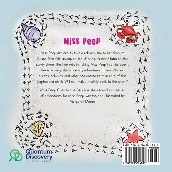 Miss Peep decides to take a relaxing trip to her favorite Beach. She falls asleep on top of her pink inner tube on the sandy shore. The tide rolls in, taking Miss Peep into the ocean. Never waking, she has many adventures at sea! Whales, turtles, dolphins, and other sea creatures take care of the big-headed chick. Will she make it safely back to the shore? Miss Peep Goes to the Beach is the second in a series of adventures for Miss Peep, written and illustrated by Margaret Moran. After days of hopping around, eating birdseed, and visiting friends, Miss Peep decided she needed a vacation! Where better to go for a relaxing time than the beach? Miss Peep found a cute blue BHBO, Bird Houses By Owner, right on the beach.