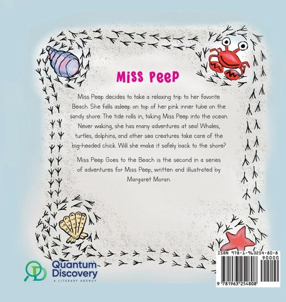 Miss Peep decides to take a relaxing trip to her favorite Beach. She falls asleep on top of her pink inner tube on the sandy shore. The tide rolls in, taking Miss Peep into the ocean. Never waking, she has many adventures at sea! Whales, turtles, dolphins, and other sea creatures take care of the big-headed chick. Will she make it safely back to the shore? Miss Peep Goes to the Beach is the second in a series of adventures for Miss Peep, written and illustrated by Margaret Moran. After days of hopping around, eating birdseed, and visiting friends, Miss Peep decided she needed a vacation! Where better to go for a relaxing time than the beach? Miss Peep found a cute blue BHBO, Bird Houses By Owner, right on the beach.