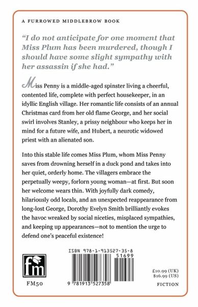 "I do not anticipate for one moment that Miss Plum has been murdered, though I should have some slight sympathy with her assassin if she had." Miss Penny is a middle-aged spinster living a cheerful, contented life, complete with perfect housekeeper, in an idyllic English village. Her romantic life consists of an annual Christmas card from her old flame George, and her social swirl involves Stanley, a prissy neighbour who keeps her in mind for a future wife, and Hubert, a neurotic widowed priest with an alienated son. Into this stable life comes Miss Plum, whom Miss Penny saves from drowning herself in a duck pond and takes into her quiet, orderly home. The villagers embrace the perpetually weepy, forlorn young woman-at first. But soon her welcome wears thin. With joyfully dark comedy, hilariously odd locals, and an unexpected reappearance from long-lost George, Dorothy Evelyn Smith brilliantly evokes the havoc wreaked by social niceties, misplaced sympathies, and keeping up appearances-not to mention the urge to defend one's peaceful existence!
