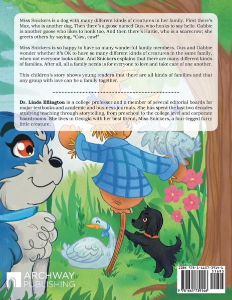 Miss Snickers is a dog with many different kinds of creatures in her family. First there's Max, who is another dog. Then there's a goose named Gus, who honks to say hello. Gabbie is another goose who likes to honk too. And then there's Hattie, who is a scarecrow; she greets others by saying, "Caw, caw!" Miss Snickers is so happy to have so many wonderful family members. Gus and Gabbie wonder whether it's OK to have so many different kinds of creatures in the same family, when not everyone looks alike. And Snickers explains that there are many different kinds of families. After all, all a…mehr
