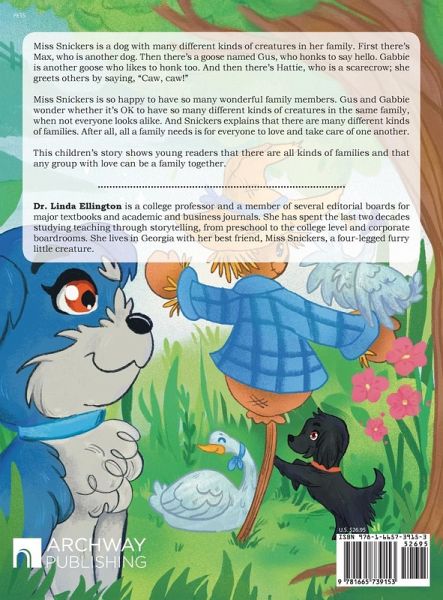Miss Snickers is a dog with many different kinds of creatures in her family. First there's Max, who is another dog. Then there's a goose named Gus, who honks to say hello. Gabbie is another goose who likes to honk too. And then there's Hattie, who is a scarecrow; she greets others by saying, "Caw, caw!" Miss Snickers is so happy to have so many wonderful family members. Gus and Gabbie wonder whether it's OK to have so many different kinds of creatures in the same family, when not everyone looks alike. And Snickers explains that there are many different kinds of families. After all, all a family needs is for everyone to love and take care of one another. This children's story shows young readers that there are all kinds of families and that any group with love can be a family together.
