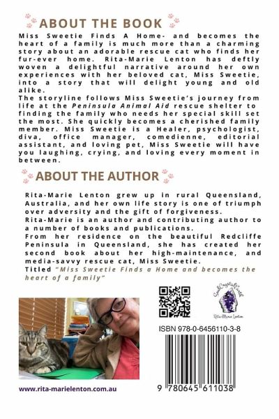 Miss Sweetie Finds A Home- and becomes the heart of a family is much more than a charming story about an adorable rescue cat who finds her fur-ever home. Rita-Marie Lenton has deftly woven a delightful narrative around her own experiences with her beloved cat, Miss Sweetie, into a story that will delight young and old alike. The storyline follows Miss Sweetie's journey from life at the Peninsula Animal Aid rescue shelter to finding the family who needs her special skill set the most. She quickly becomes a cherished family member. Miss Sweetie is a Healer, psychologist, diva, office manager, comedienne, editorial assistant, and loving pet, Miss Sweetie will have you laughing, crying, and loving every moment in between.