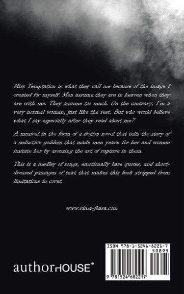 Miss Temptation is what they call me because of the image I created for myself. Men assume they are in heaven when they are with me. They assume too much. On the contrary, I?m a very normal woman, just like the rest. But who would believe what I say especially after they read about me? A musical in the form of a fiction novel that tells the story of a seductive goddess that made men yearn for her and women imitate her by arousing the art of rapture in them. This is a medley of songs, emotionally bare quotes, and short-dressed passages of text that makes this book stripped from limitations in covet. www.rima-jbara.com