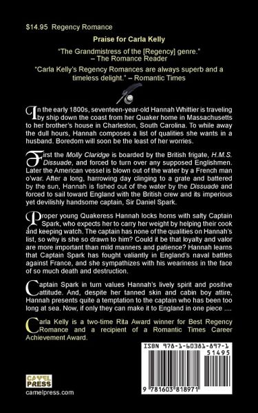 In the early 1800s, seventeen-year-old Hannah Whittier is traveling by ship down the coast from her Quaker home in Massachusetts to her brother's house in Charleston, South Carolina. To while away the dull hours, Hannah composes a list of qualities she wants in a husband. Boredom will soon be the least of her worries. First the Molly Claridge is boarded by the British frigate, H.M.S. Dissuade, and forced to turn over any supposed Englishmen. Later the American vessel is blown out of the water by a French man o'war. After a long, harrowing day clinging to a grate and battered by the sun, Hannah is fished out of the water by the Dissuade and forced to sail toward England with the British crew and its imperious yet devilishly handsome captain, Sir Daniel Spark. Proper young Quakeress Hannah locks horns with salty Captain Spark, who expects her to carry her weight by helping their cook and keeping watch. The captain has none of the qualities on Hannah's list, so why is she so drawn to him? Could it be that loyalty and valor are more important than mild manners and patience? Hannah learns that Captain Spark has fought valiantly in England's naval battles against France, and she sympathizes with his weariness in the face of so much death and destruction. Captain Spark in turn values Hannah's lively spirit and positive attitude. And, despite her tanned skin and cabin boy attire, Hannah presents quite a temptation to the captain who has been too long at sea. Now, if only they can make it to England in one piece ...