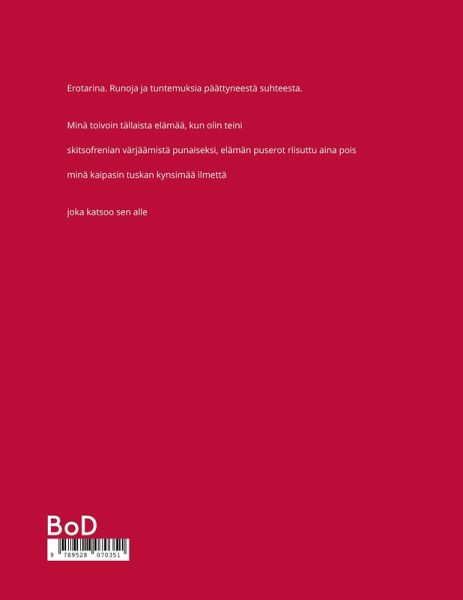 Erotarina. Runoja ja tuntemuksia päättyneestä suhteesta. Minä toivoin tällaista elämää, kun olin teini skitsofrenian värjäämistä punaiseksi, elämän puserot riisuttu aina pois minä kaipasin tuskan kynsimää ilmettä joka katsoo sen alle