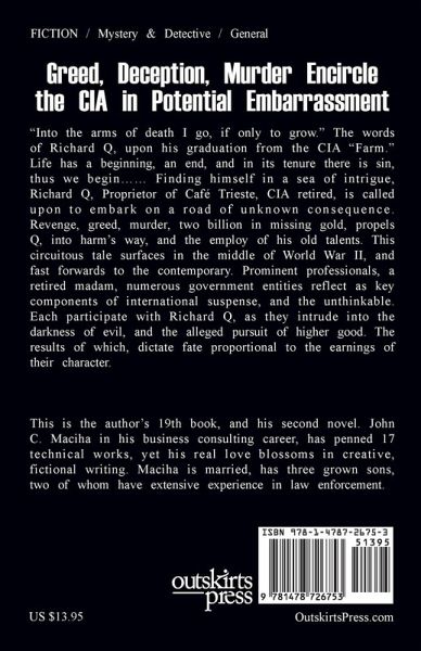 Greed, Deception, Murder Encircle the CIA in Potential Embarrassment... "Into the arms of death I go, if only to grow." The words of Richard Q, upon his graduation from the CIA "Farm." Life has a beginning, an end, and in its tenure there is sin, thus we begin...... Finding himself in a sea of intrigue, Richard Q, Proprietor of Café Trieste, CIA retired, is called upon to embark on a road of unknown consequence. Revenge, greed, murder, two billion in missing gold, propels Q, into harm's way, and the employ of his old talents. This circuitous tale surfaces in the middle of World War II, and fast forwards to the contemporary. Prominent professionals, a retired madam, numerous government entities reflect as key components of international suspense, and the unthinkable. Each participate with Richard Q, as they intrude into the darkness of evil, and the alleged pursuit of higher good. The results of which, dictate fate proportional to the earnings of their character.