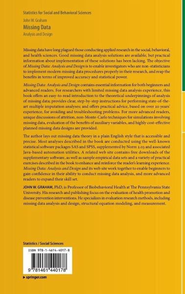 Missing Data: Analysis and Design contains essential information for both beginners and advanced readers. For researchers with limited missing data analysis experience, this book offers an easy-to-read introduction to the theoretical underpinnings of analysis of missing data; provides clear, step-by-step instructions for performing state-of-the-art multiple imputation analyses; and offers practical advice, based on over 20 years' experience, for avoiding and troubleshooting problems. For more advanced readers, unique discussions of attrition, non-Monte-Carlo techniques for simulations involving missing data, evaluation of the benefits of auxiliary variables, and highly cost-effective planned missing data designs are provided.