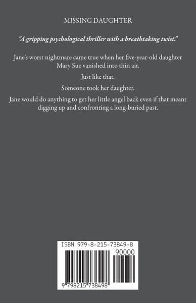 Jane's worst nightmare came true when her five-year-old daughter Mary Sue vanished into thin air. Just like that. Someone took her daughter. Jane would do anything to get her little angel back even if that meant digging up and confronting a long-buried past.