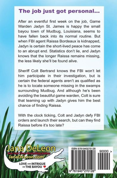After an eventful first week on the job, Game Warden Jadyn St. James is happy the small bayou town of Mudbug, Louisiana, seems to have fallen back into its normal routine. But when FBI agent Raissa Bordeaux is kidnapped, Jadyn is certain the short-lived peace has come to an abrupt end. Statistics don't lie, and Jadyn knows that the longer Raissa remains missing, the less likely she'll be found alive. Sheriff Colt Bertrand knows the FBI won't let him participate in their investigation, but is certain the federal agents aren't as qualified as he is to locate someone missing in the swamps surrounding Mudbug. And although he's been avoiding the beautiful game warden, Colt is sure that teaming up with Jadyn gives him the best chance of finding Raissa.With the clock ticking, Colt and Jadyn defy FBI orders and launch their search, but can they find Raissa before it's too late?