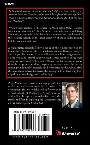 To Humbolt's surprise, Schwimer has much different news. "I have just returned from the Cascades and believe I have found the missing link." There is a pause at Humbolt's end. Schwimer softly shouts, "Did you hear me, Humbolt?" When a new creature is discovered in Washington State's Cascade Mountains, adversaries Arthur Schwimer, an evolutionist, and Gary Humbolt, a creationist, join forces in a common quest to determine the scientific veracity of the latest discovery of the so-called missing link between ape and man. A sophisticated research facility is set up in the remote section of the forest where the creatures live. The substantiation of Darwin's theory- and the possible demise of the world's most established religions-rest on the results. But after the analysis begins, three members of the study group are mysteriously killed. Judith Moses, Humbolt's assistant, wades through the perplexing clues, desperately seeking answers before the seemingly indisputable research can be presented to the public. Have the researchers indeed discovered the missing link, or have they been duped by a marvel of genetic engineering?