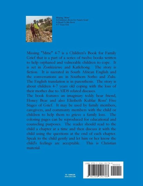 Missing "Mme" 4-7 is a Children's Book for Family Grief to help children 4-7 years old to cope with the loss of a family member. It is narrated in South African English and the conversations are in Southern Sotho and Zulu. The English translation is in parenthesis. It is set in Zonkizizwe and Katlehong, South Africa. The story of a family of three generations is fiction, made-up. It features an imaginary teddy bear friend, Honey Bear, coloring pictures, and Elizabeth Kublar-Ross' Five Stages of Grief. Family members, caregivers, and community members can read it with the child and discuss it using the questions at the end of the chapters and the coloring pictures. It is Christian material written for children who are orphaned and vulnerable.