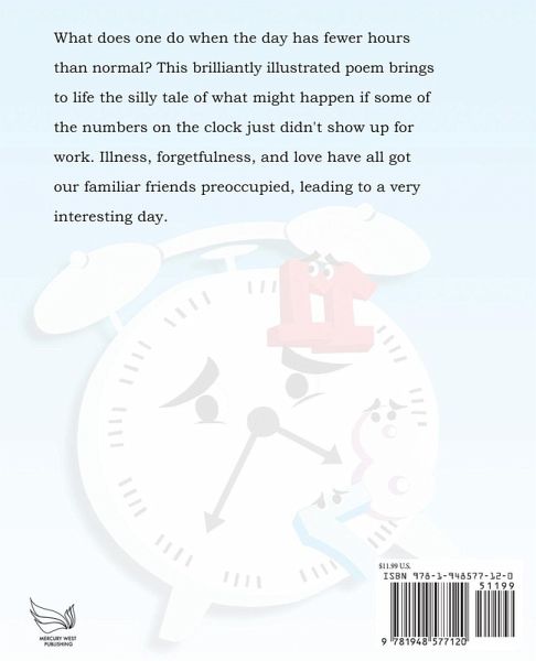 What does one do when the day has fewer hours than normal? This brilliantly illustrated poem brings to life the silly tale of what might happen if some of the numbers on the clock just didn't show up for work. Illness, forgetfulness, and love have all got our familiar friends preoccupied, leading to a very interesting day.