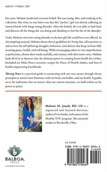 For years, Melanie Jatsek had everyone fooled. She was young, thin, and studying to be a dietitian. But what no one knew was that this "perfect" girl was silently suffering an internal battle with binge eating disorder. After she healed, she was able to look back and discover all the things she was doing and thinking to fuel the fire of the disorder. Today Melanie views her eating disorder as the best gift life could have ever offered. In this inspiring manual, Melanie shares eleven guidelines for living that call attention to and correct the self-defeating thoughts, behaviors, and choices that keep us from fully accessing peace, health, and well-being. While encouraging others to view imperfections as perfections, choose their words carefully, and connect with their inner voice, Melanie leads all of us to discover that the ultimate power to creating better health lies within. Included are Make Peace exercises, recipes for Peace of Health shakes, and lists of health-empowering Earthfoods. Missing Peace is a practical guide to connecting with our true nature through eleven principles to restore inner harmony with our food, our bodies, and our health. It guides us to the realization that no matter what our current situation, we hold within us the power to peace.