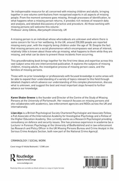 Karen Shalev Greene is the founder and Director of the Centre of the Study of Missing Persons at the University of Portsmouth. Her research focuses on missing persons and she collaborates with academics, law enforcement agencies and NGOs across the UK and internationally. Llian Alys is a British Psychological Society Chartered Psychologist and Associate Fellow, a Full Associate of the International Academy for Investigative Psychology and a Fellow of the Higher Education Academy. She currently works as a Research Psychologist providing consultancy on defence and security issues. She has previous experience in academia (as a Lecturer in Forensic Psychology at the University of Bedfordshire) and in law enforcement (as Research and Policy Officer in the UK Missing Persons Bureau and Crime Analyst in the Serious Crime Analysis Section, both now part of the National Crime Agency).