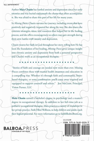 This book begins with Maia's journey and the joyful and despairing surprises along the way. Throughout her battle with depression and anxiety, Maia has found concrete resources and strategies that have helped her and she wants to share them to help others on their journey. Maia's faith in God is interwoven throughout the book and has been the foundation of her healing.
