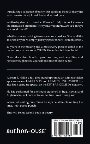 Introducing a collection of poetry that speaks to the soul of anyone who has ever lived, loved, lost and looked back. Written by stand up comedian Warren B. Hall, this book answers the often asked questions: "Are you always funny, are you always in a good mood?" Whether you are looking to see someone who doesn't have all the answers or you're simply just trying to connect...read this book. 20 years in the making and almost every piece is dated at the bottom so you can know WHEN the author felt how he felt. Now take a deep breath, open the cover, and be willing and honest enough to see yourself on some of these pages.