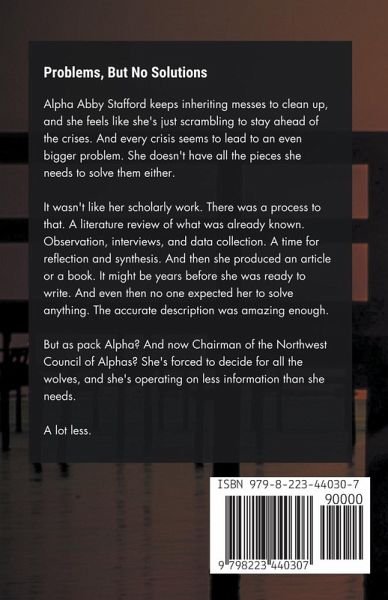Problems, But No Solutions Alpha Abby Stafford keeps inheriting messes to clean up, and she feels like she's just scrambling to stay ahead of the crises. And every crisis seems to lead to an even bigger problem. She doesn't have all the pieces she needs to solve them either. This wasn't like her scholarly work. There was a process to that. A literature review of what was already known. Observation, interviews, data collection. A time for reflection and synthesis. And then she produced an article or a book. It might be years before she was ready to write. And even then no one expected her to solve anything. Accurate description was amazing enough. But as pack Alpha? And now Chairman of the Northwest Council of Alphas? She's forced to decide for all the wolves - right now - and she's operating on less information than she needs. A lot less. Book 5 in Wolf Harbor, a paranormal suspense series.