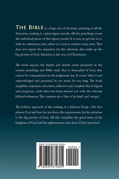 The Bible is a huge mix of doctrines pointing in all the directions, from creation to the very end of this world making it a giant jigsaw puzzle. All the preaching covers the individual pieces of this jigsaw puzzle. With its voluminous text it is easy to get lost in it. This is when it is read at random every time. That does not expose the sequences and the steps for baptism, faith and the salvation that make up the big picture of God. Salvation is the crux of Christianity. This is when so much is preached from the Bible, presenting only a selective, restrictive and the need to know only doctrines which has little or nothing to do with this big picture. The book answers all the fundamentals, the basics and the essentials going into the depths and details that is never acknowledged nor preached anywhere. It is valuable for those Bible enthusiasts who want to think outside the square box, with all the intricacies that are exposed while reading the Bible. It ties up almost all the loose ends and joins all the dots to see the big picture of God with the numerous relevant biblical references not presented previously. It presents a balanced insider role and status, against the commonly perceived ringside spectator view that is regularly preached and presented without any commitments, obligations and responsibilities to God and man. The numerous doctrines casually mentioned off hand and at random are simplified, sequenced, structured, collectively and complete with its relevance, as a do-it-yourself application. It does not add, delete or deny anything, presenting the doctrines which supersede everything else for the salvation of God. All this forms the sum and substance of the good news of the kingdom of God and his righteousness that Jesus Christ preached. The book is highly technical covering numerous topics in all the permutations and combinations for seminars and conferences not presented previously. It is needed by family counsellors, prayer warriors, Bible teachers, worship leaders and preachers. It is valuable for the believers across the denominational divide for their personal study and introspection before God and man. This book may be shared with the non-believers who want to know Jesus Christ at the personal level, without all the denominational dogmas routinely and regularly superimposed distorting and deviating the big picture of God. It maintains the integrity of the Bible without endorsing or damning any church or denomination. Nor does it judge any believer or any other religion. The holistic approach of trying to comprehend the making of a believer, living a life that pleases God and last, but not least, not losing the very sense of direction for his salvation is the big picture of God.