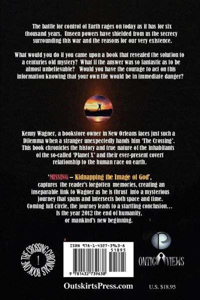 The battle for control of Earth rages on today as it has for six thousand years. Unseen powers have shielded from us the secrecy surrounding this war and the reasons for our very existence. What would you do if you came upon a book that revealed the solution to a centuries old mystery? What if the answer was so fantastic as to be almost unbelievable? Would you have the courage to act on this information knowing that your own life would be in immediate danger? Kenny Wagner, a bookstore owner in New Orleans faces just such a Dilemma when a stranger unexpectedly hands him 'The Crossing' This book chronicles the history and true nature of the inhabitants of the so-called 'Planet X' and their ever-present covert relationship to the human race on earth. 'MISSING - Kidnapping the Image of God', captures the reader's forgotten memories, creating an inseparable link to Wagner as he is thrust into a mysterious journey that spans and intersects both space and time. Coming full circle, the journey leads to a startling conclusion...Is the year 2012 the end of humanity, or mankind's new beginning.