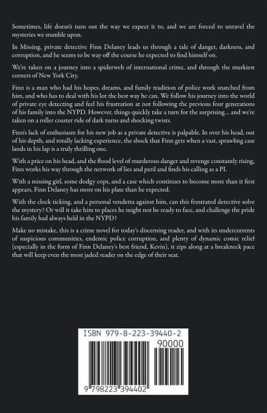 Sometimes, life doesn't turn out the way we expect it to, and we are forced to unravel the mysteries we stumble upon. In Missing, private detective Finn Delaney leads us through a tale of danger, darkness, and corruption, and he seems to be way off the course he expected to find himself on. We're taken on a journey into a spiderweb of international crime, and through the murkiest corners of New York City. Finn is a man who had his hopes, dreams, and family tradition of police work snatched from him, and who has to deal with his lot the best way he can. We follow his journey into the world of private eye detecting and feel his frustration at not following the previous four generations of his family into the NYPD. However, things quickly take a turn for the surprising… and we're taken on a roller coaster ride of dark turns and shocking twists. Finn's lack of enthusiasm for his new job as a private detective is palpable. In over his head, out of his depth, and totally lacking experience, the shock that Finn gets when a vast, sprawling case lands in his lap is a truly thrilling one. With a price on his head, and the flood level of murderous danger and revenge constantly rising, Finn works his way through the network of lies and peril and finds his calling as a PI. With a missing girl, some dodgy cops, and a case which continues to become more than it first appears, Finn Delaney has more on his plate than he expected. With the clock ticking, and a personal vendetta against him, can this frustrated detective solve the mystery? Or will it take him to places he might not be ready to face, and challenge the pride his family had always held in the NYPD? Make no mistake, this is a crime novel for today's discerning reader, and with its undercurrents of suspicious communities, endemic police corruption, and plenty of dynamic comic relief (especially in the form of Finn Delaney's best friend, Kevin), it zips along at a breakneck pace that will keep even the most jaded reader on the edge of their seat.