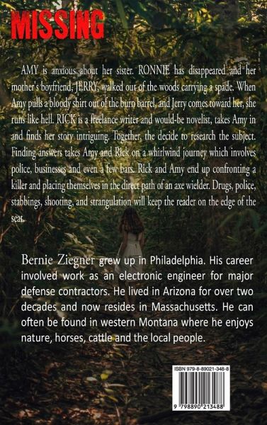 AMY is anxious about her sister. RONNIE has disappeared and her mother's boyfriend, JERRY, walked out of the woods carrying a spade. When Amy pulls a bloody shirt out of the burn barrel, and Jerry comes toward her, she runs like hell. RICK is a freelance writer and would-be novelist, takes Amy in and finds her story intriguing. Together, the decide to research the subject. Finding answers takes Amy and Rick on a whirlwind journey which involves police, businesses and even a few bars. Rick and Amy end up confronting a killer and placing themselves in the direct path of an axe wielder. Drugs, police, stabbings, shooting, and strangulation will keep the reader on the edge of the seat.
