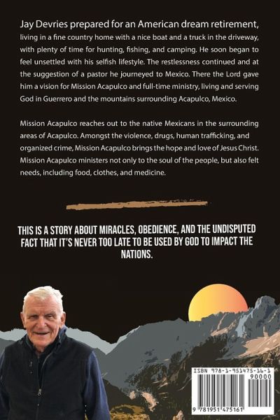 Jay De Vries prepared for an American dream retirement, which meant living in a nice country home with a nice boat and a truck in the driveway, and plenty of time for hunting, fishing, and camping. He soon began to feel unsettled with his selfish lifestyle. The restlessness continued and at the suggestion of a pastor he journeyed to Mexico and there the Lord gave him a vision for Mission Acapulco and full-time ministry living and serving God in Guerro and the mountains surrounding Acapulco, Mexico. Mission Acapulco reaches out to the native Mexicans in the area that surrounds Acapulco. Amongst the violence of drug and human trafficking and organized crime, Mission Acapulco brings the hope and love of Jesus Christ. We minister not only to the soul of the people, but also materially, through food, clothes, medicine, and other basic needs. This is a story about miracles, obedience, and the undisputed fact that it's never too late to be used by God to impact the nations.