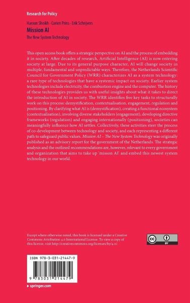 This open access book offers a strategic perspective on AI and the process of embedding it in society. After decades of research, Artificial Intelligence (AI) is now entering society at large. Due to its general purpose character, AI will change society in multiple, fundamental and unpredictable ways. Therefore, the Netherlands Scientific Council for Government Policy (WRR) characterizes AI as a system technology: a rare type of technologies that have a systemic impact on society. Earlier system technologies include electricity, the combustion engine and the computer. The history of these technologies provides us with useful insights about what it takes to direct the introduction of AI in society. The WRR identifies five key tasks to structurally work on this process: demystification, contextualisation, engagement, regulation and positioning. By clarifying what AI is (demystification), creating a functional ecosystem (contextualisation), involving diverse stakeholders (engagement), developing directive frameworks (regulation) and engaging internationally (positioning), societies can meaningfully influence how AI settles. Collectively, these activities steer the process of co-development between technology and society, and each representing a different path to safeguard public values. Mission AI - The New System Technology was originally published as an advisory report for the government of the Netherlands. The strategic analysis and the outlined recommendations are, however, relevant to every government and organization that aims to take up 'misson AI' and embed this newest system technology in our world.