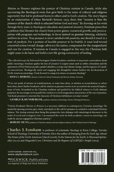 Mission as Penance explores the posture of Christian mission in Canada, while also uncovering the theological roots that gave birth to the sense of cultural and religious superiority that led to profound harm to others and to God's creation. The story begins by an examination of Johan Bavinck's famous 1954 claim that ""mission is thus the penance of the church which is ashamed before God and man."" By drawing on his work through forty years in theological education and pastoral ministry, Fensham prescribes a pathway that liberates the church from power games, numerical growth, and preoccupation with programs and technology, to focus instead on genuine listening, solidarity, and love in action. True penance is never satisfied with passivity, nor should it result in a state of paralysis. For a posture of humble penance to be fruitful, it must lead toward concerted action toward change, advocacy for justice, compassion for the marginalized, and care for creation. If mission in Canada is engaged in this way, the Christian faith might cease to do harm and build a new life-giving community of healing.
