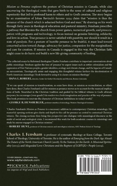 Mission as Penance explores the posture of Christian mission in Canada, while also uncovering the theological roots that gave birth to the sense of cultural and religious superiority that led to profound harm to others and to God's creation. The story begins by an examination of Johan Bavinck's famous 1954 claim that ""mission is thus the penance of the church which is ashamed before God and man."" By drawing on his work through forty years in theological education and pastoral ministry, Fensham prescribes a pathway that liberates the church from power games, numerical growth, and preoccupation with programs and technology, to focus instead on genuine listening, solidarity, and love in action. True penance is never satisfied with passivity, nor should it result in a state of paralysis. For a posture of humble penance to be fruitful, it must lead toward concerted action toward change, advocacy for justice, compassion for the marginalized, and care for creation. If mission in Canada is engaged in this way, the Christian faith might cease to do harm and build a new life-giving community of healing.